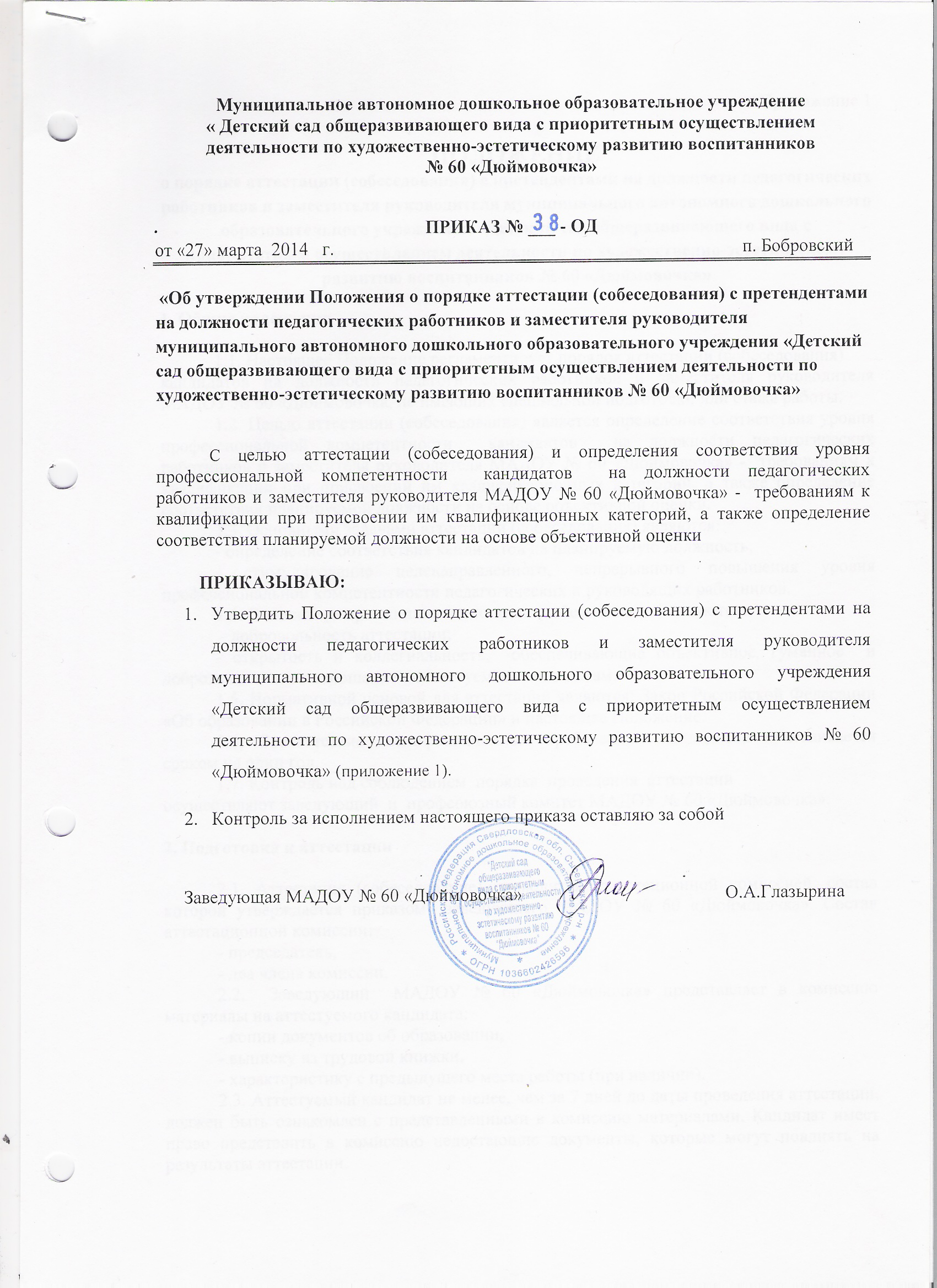 Приказ 38-ОД от 27.03.2014 Об утверждении Положения о порядке аттестации (собеседования) с претендентами на должность педагогических работников и заместителя руководителя.bmp